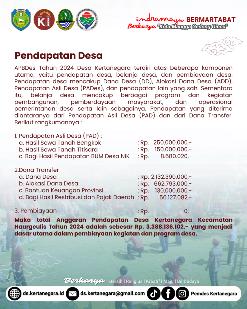 Desa Kertanegara, yang terletak di Kecamatan Haurgeulis, Kabupaten Indramayu, telah menyusun Laporan Realisasi Anggaran Pendapatan dan Belanja Desa (APBDes) Tahun Anggaran 2024 sebagai bentuk transparansi dan akuntabilitas terhadap pengelolaan keuangan desa. Laporan ini mencakup realisasi pendapatan, belanja, dan pembiayaan yang telah diimplementasikan selama satu tahun anggaran. Berikut adalah ulasan mendalam mengenai laporan ini.